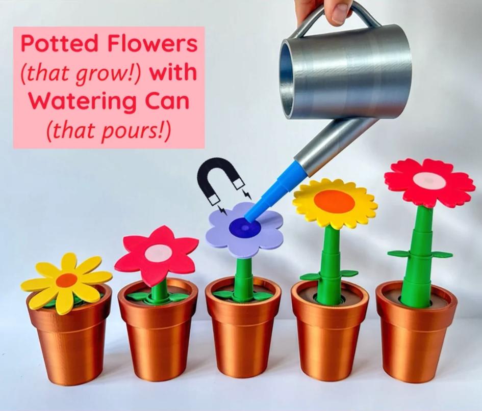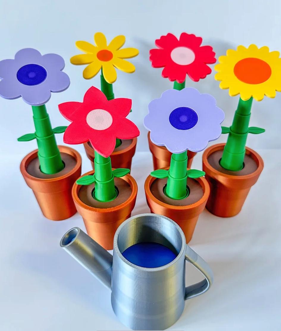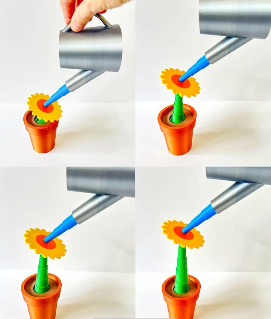 🌻 Watch your flowers grow with a little "water"! This 3D-printed interactive flower pot features adorable potted flowers that extend as you "water" them with the included magnetic watering can! A perfect desk toy, sensory experience, or unique gift for nature lovers of all ages.
