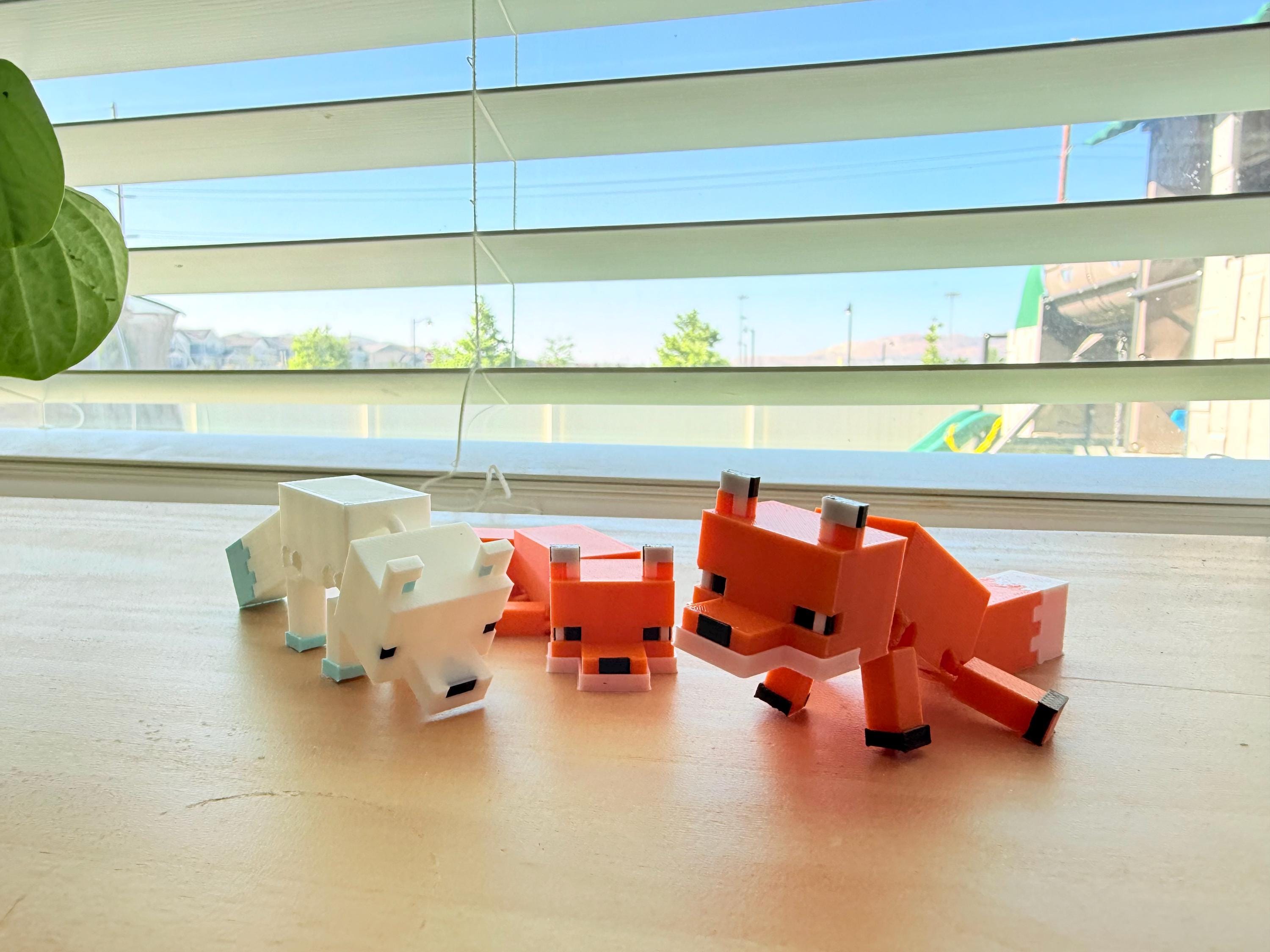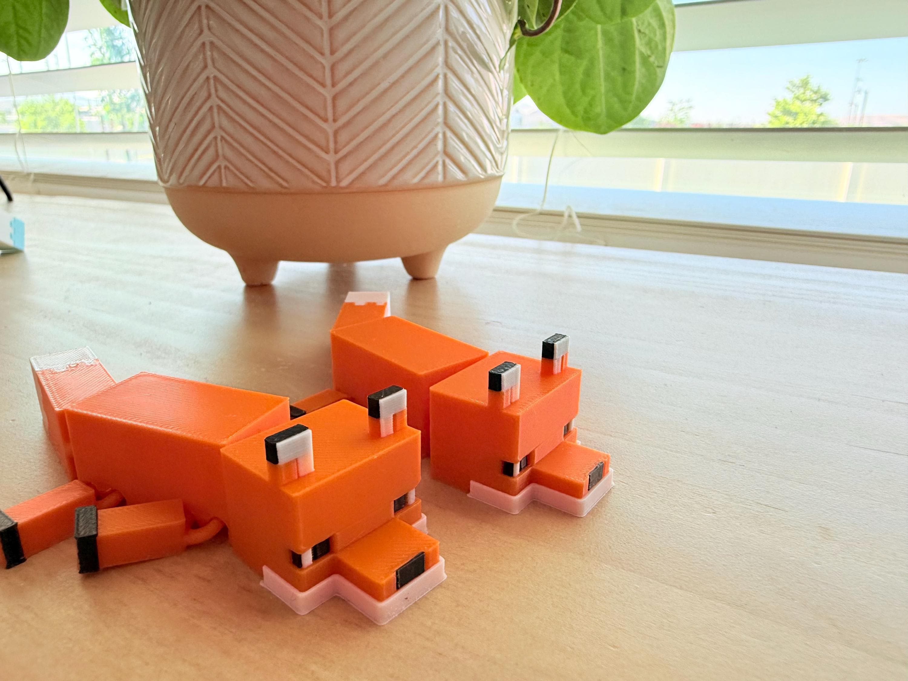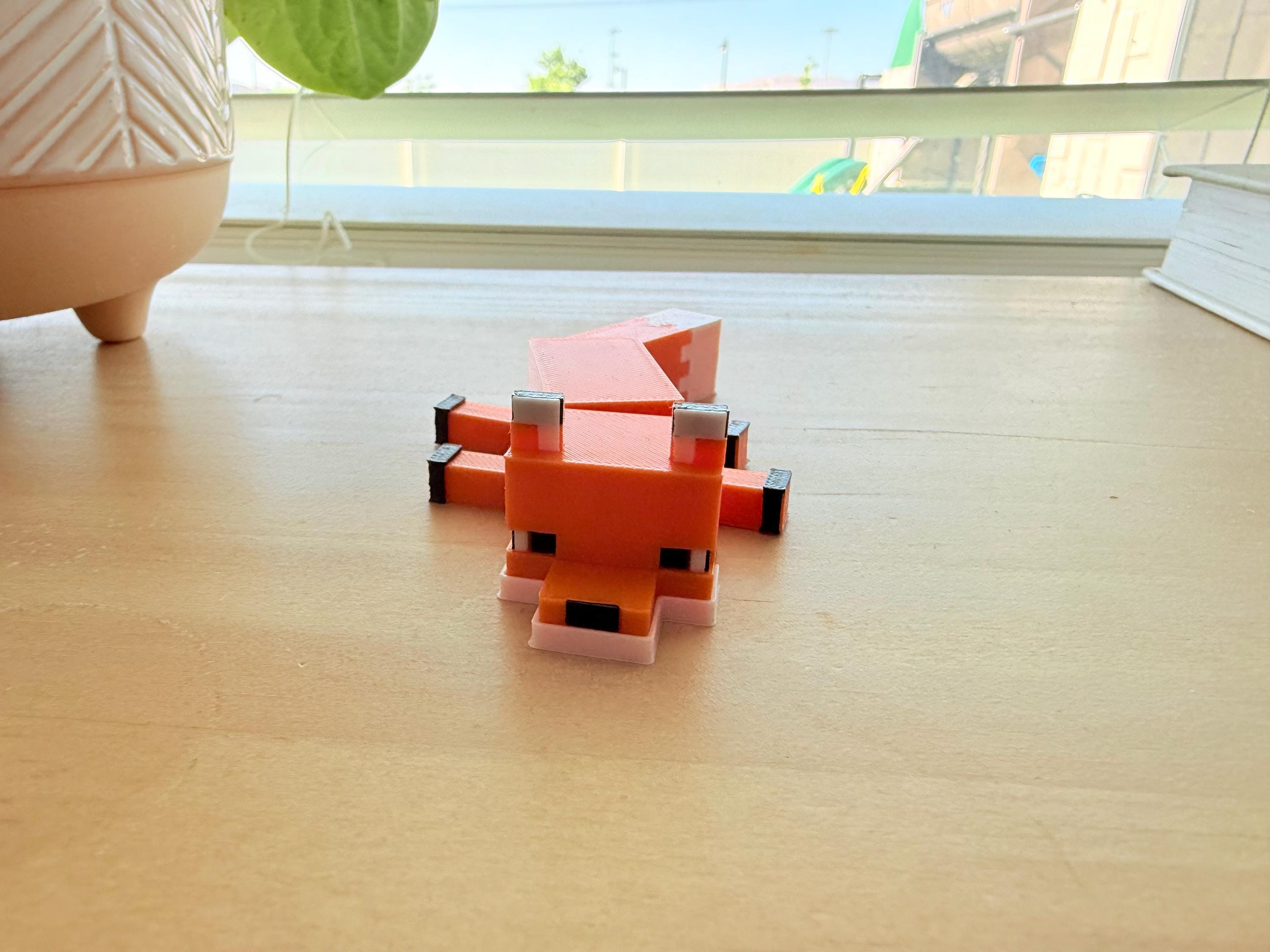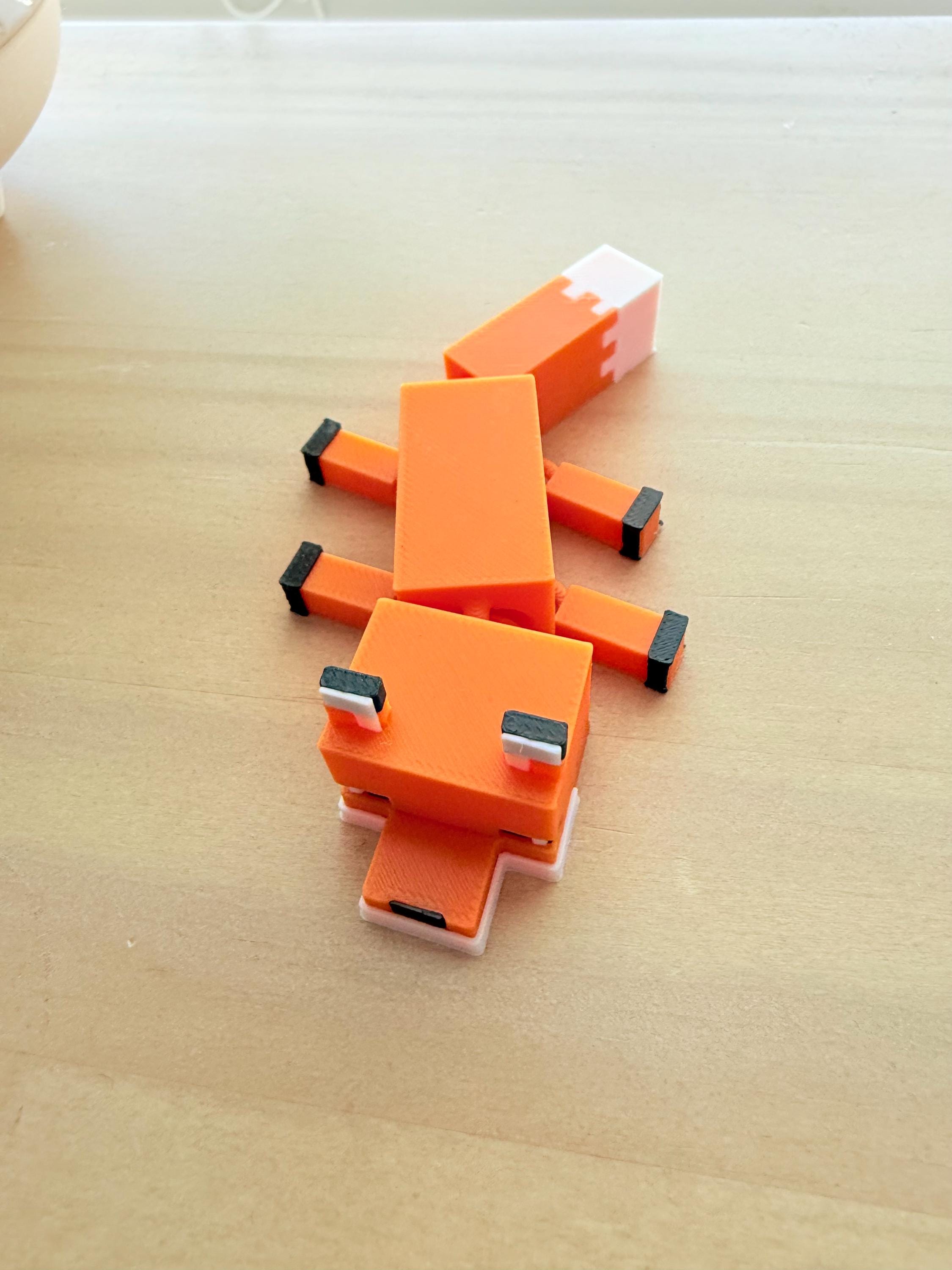 🦊 What You’ll Get • 1x Flexi Fox (fully printed & assembled – no support removal required!) • Size: approx 4 inches long • Colors: Classic Minecraft orange, white, and black pixel styling