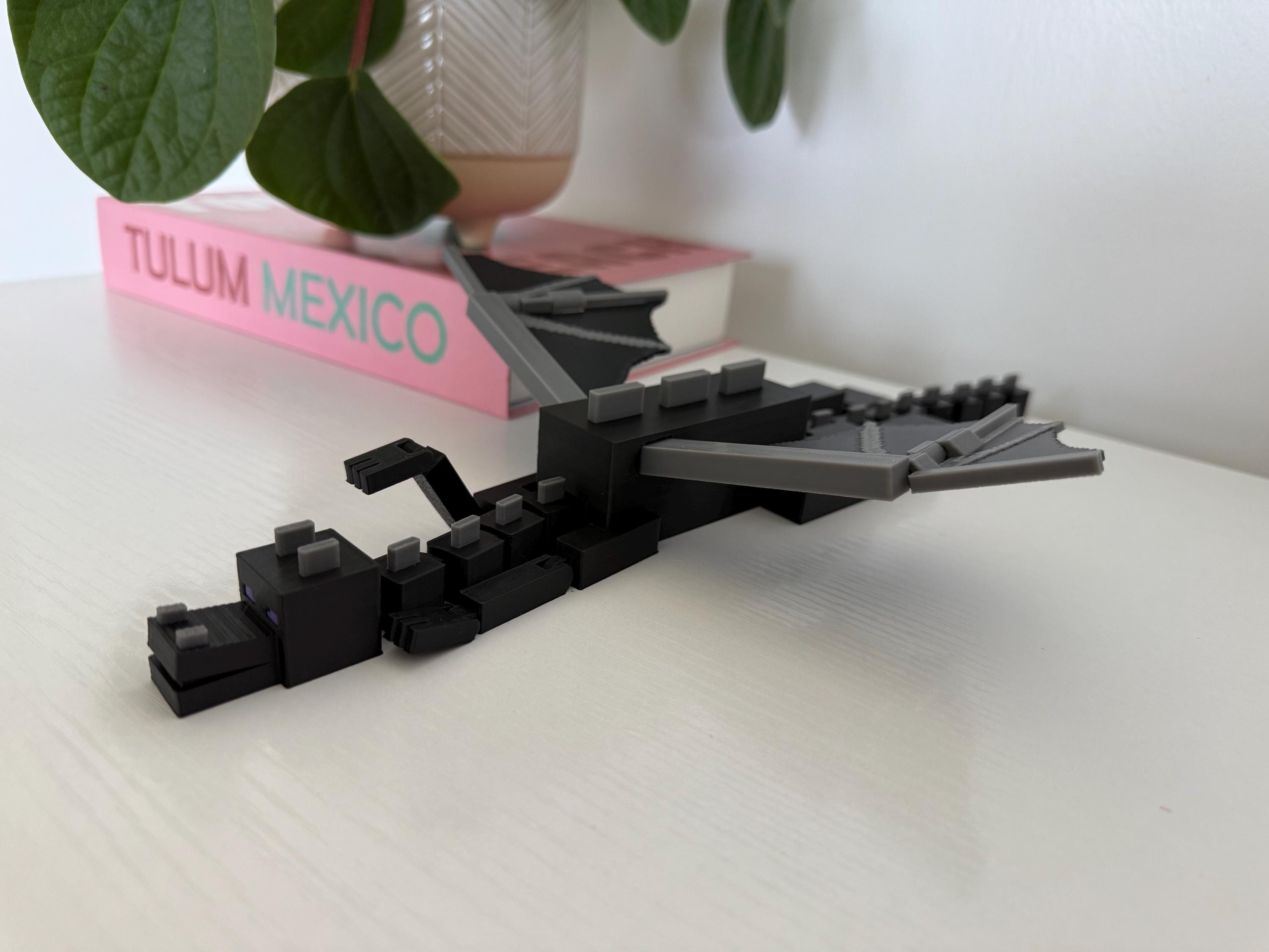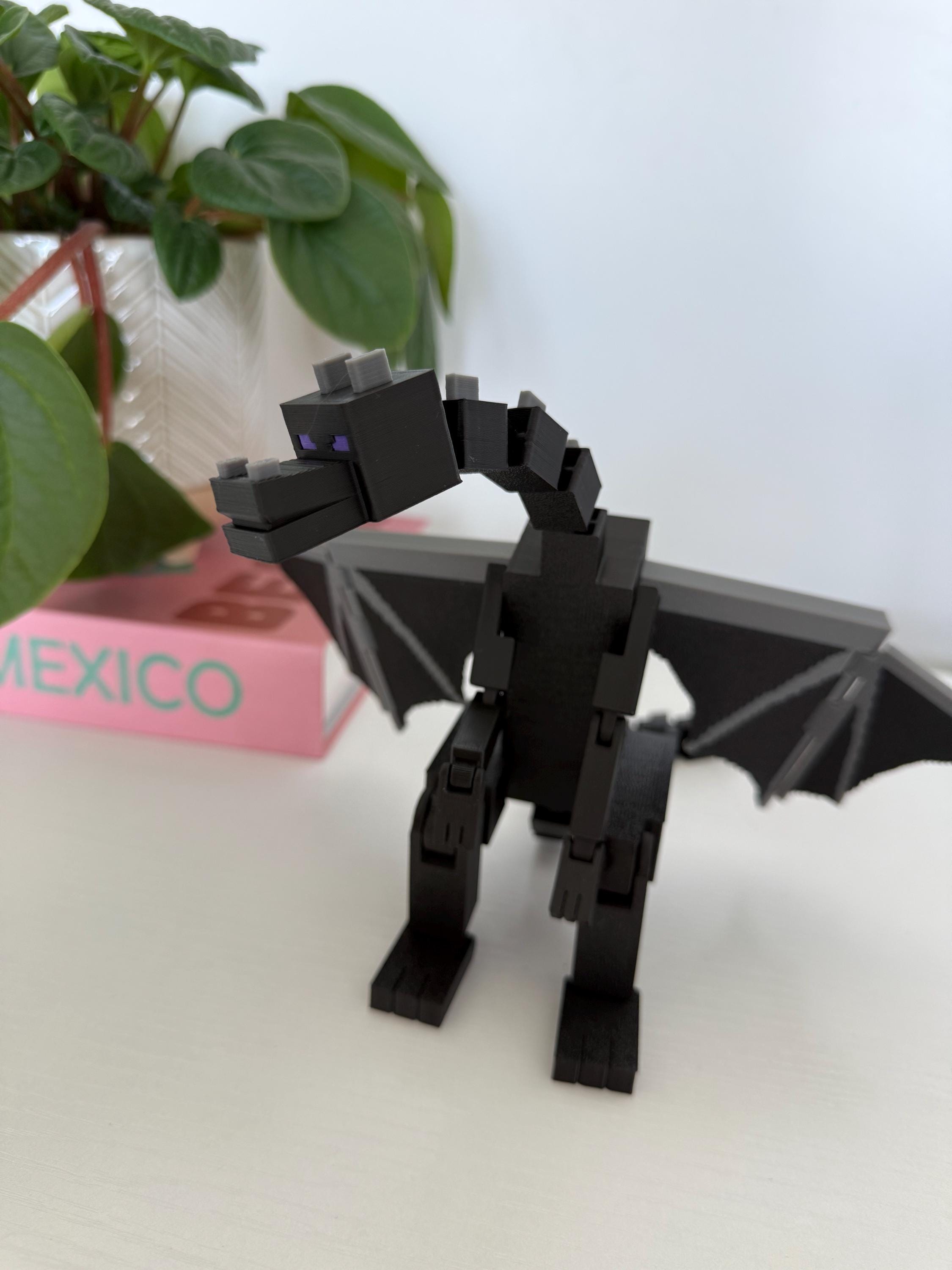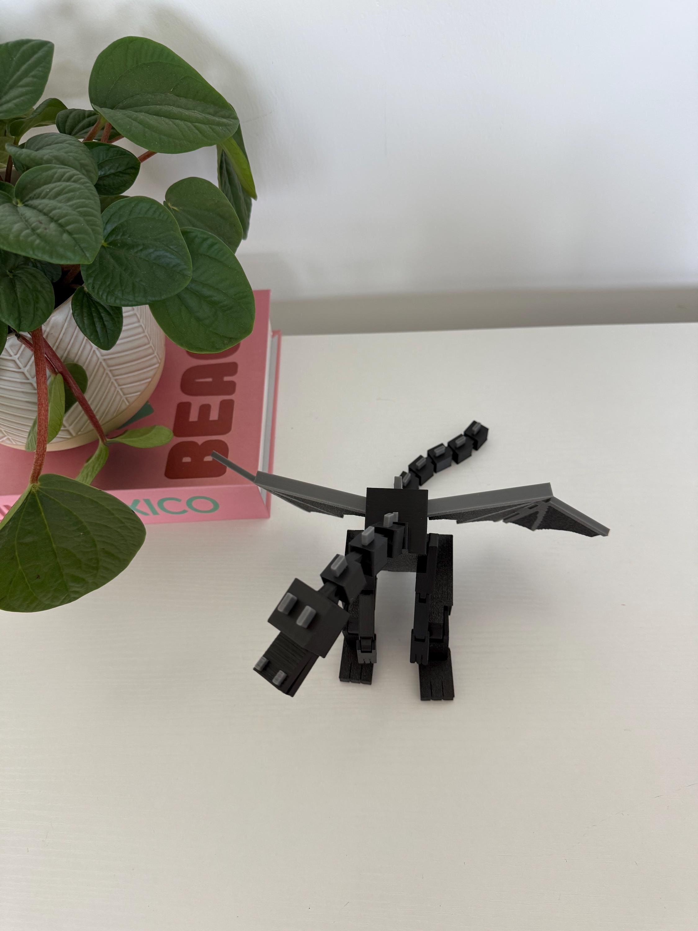Bring the End with you! This 3D printed Minecraft-inspired Ender Dragon stretches 13 inches from tip to tail and 9 inches wide with fully articulated legs, arms, wings, and tail. Designed to move, pose, and impress, this black and gray beast makes the perfect shelf collectible or gift for the gamer in your life!