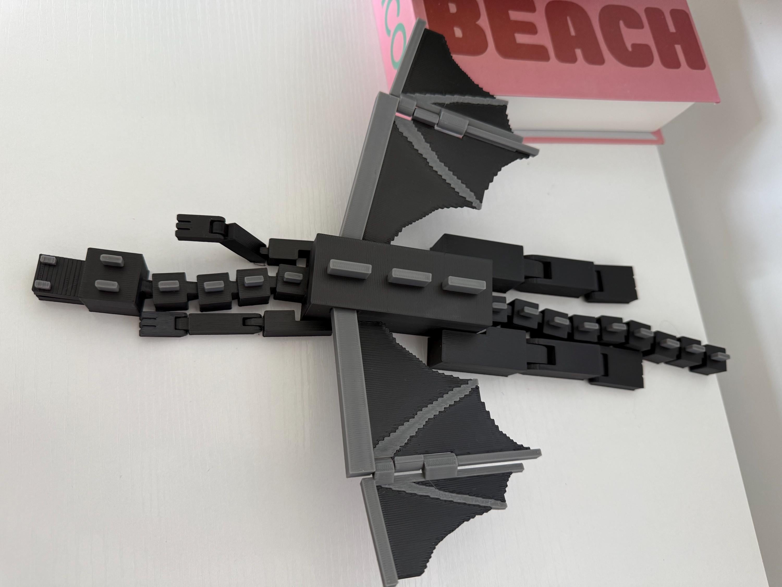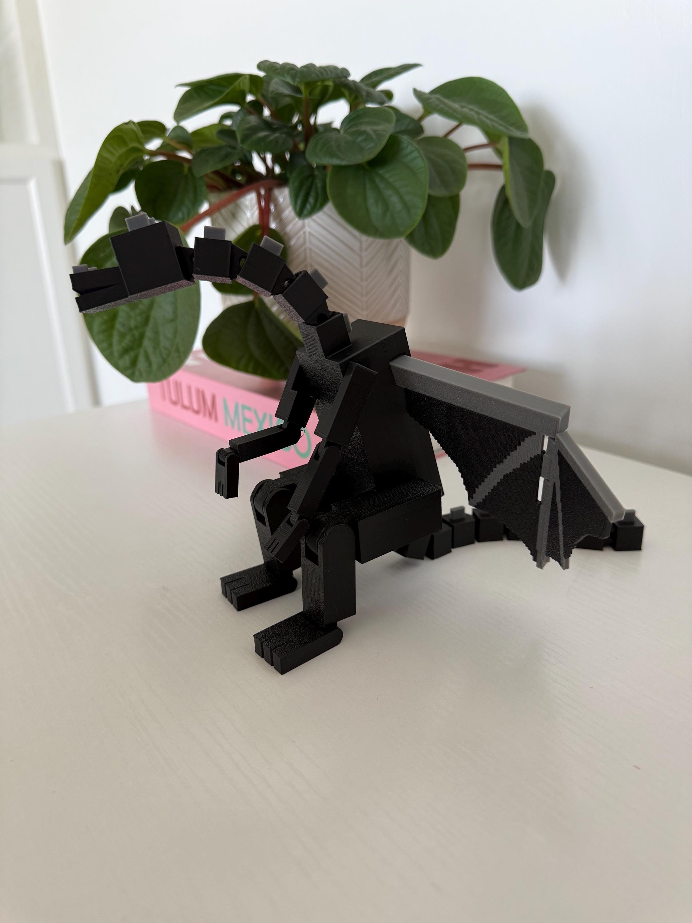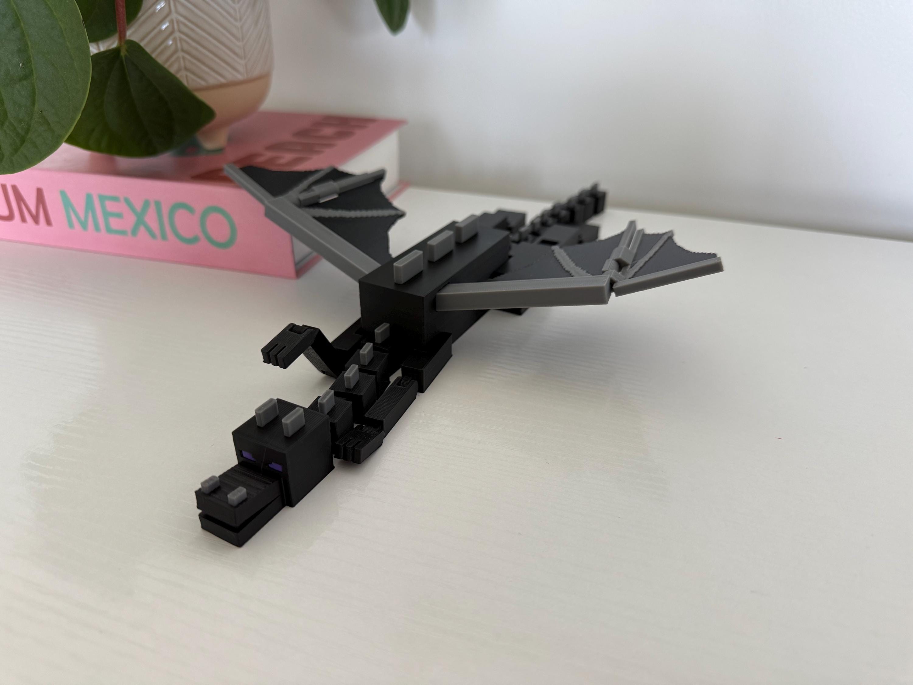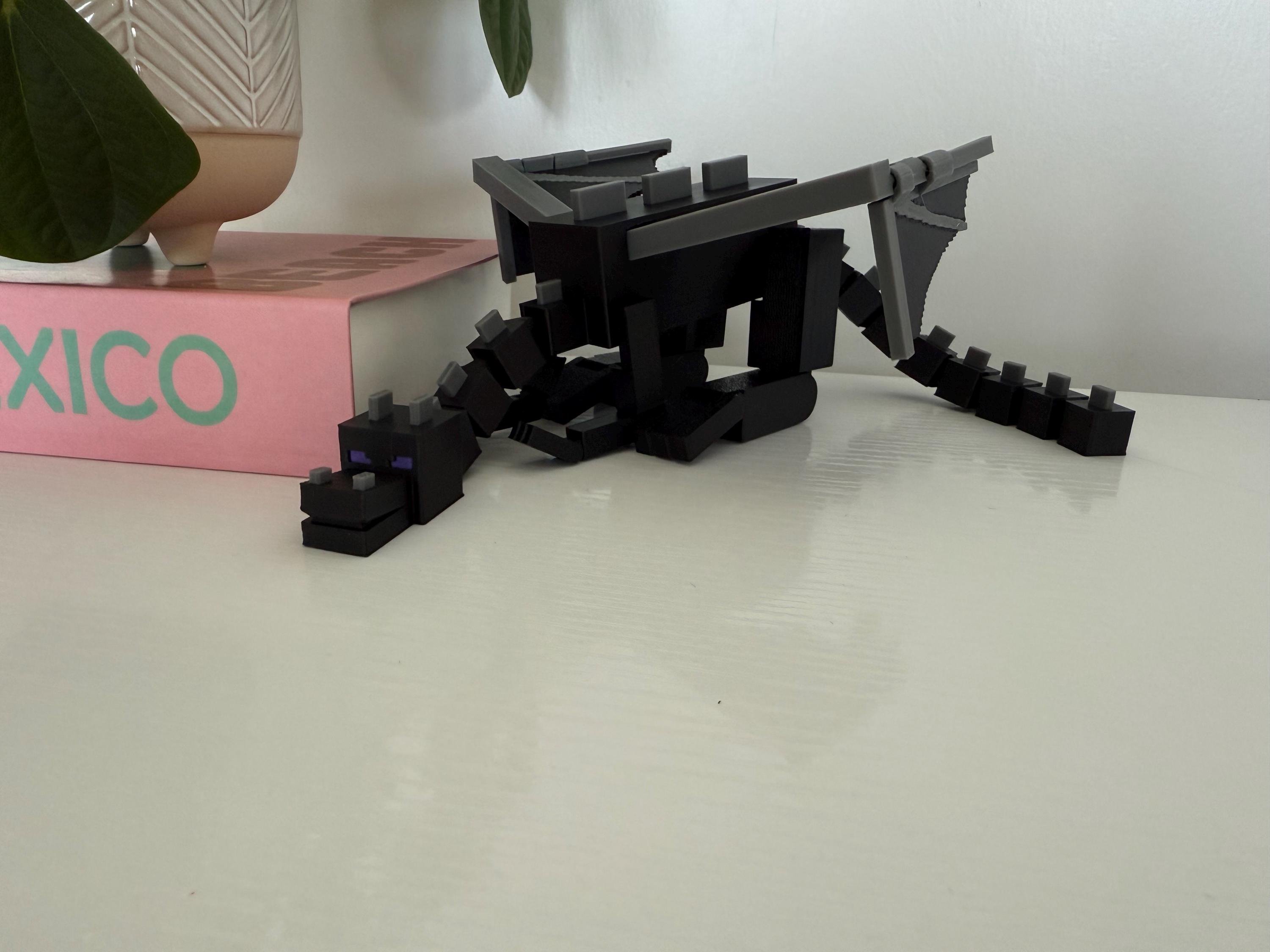 Bring the End with you! This 3D printed Minecraft-inspired Ender Dragon stretches 13 inches from tip to tail and 9 inches wide with fully articulated legs, arms, wings, and tail. Designed to move, pose, and impress, this black and gray beast makes the perfect shelf collectible or gift for the gamer in your life!