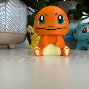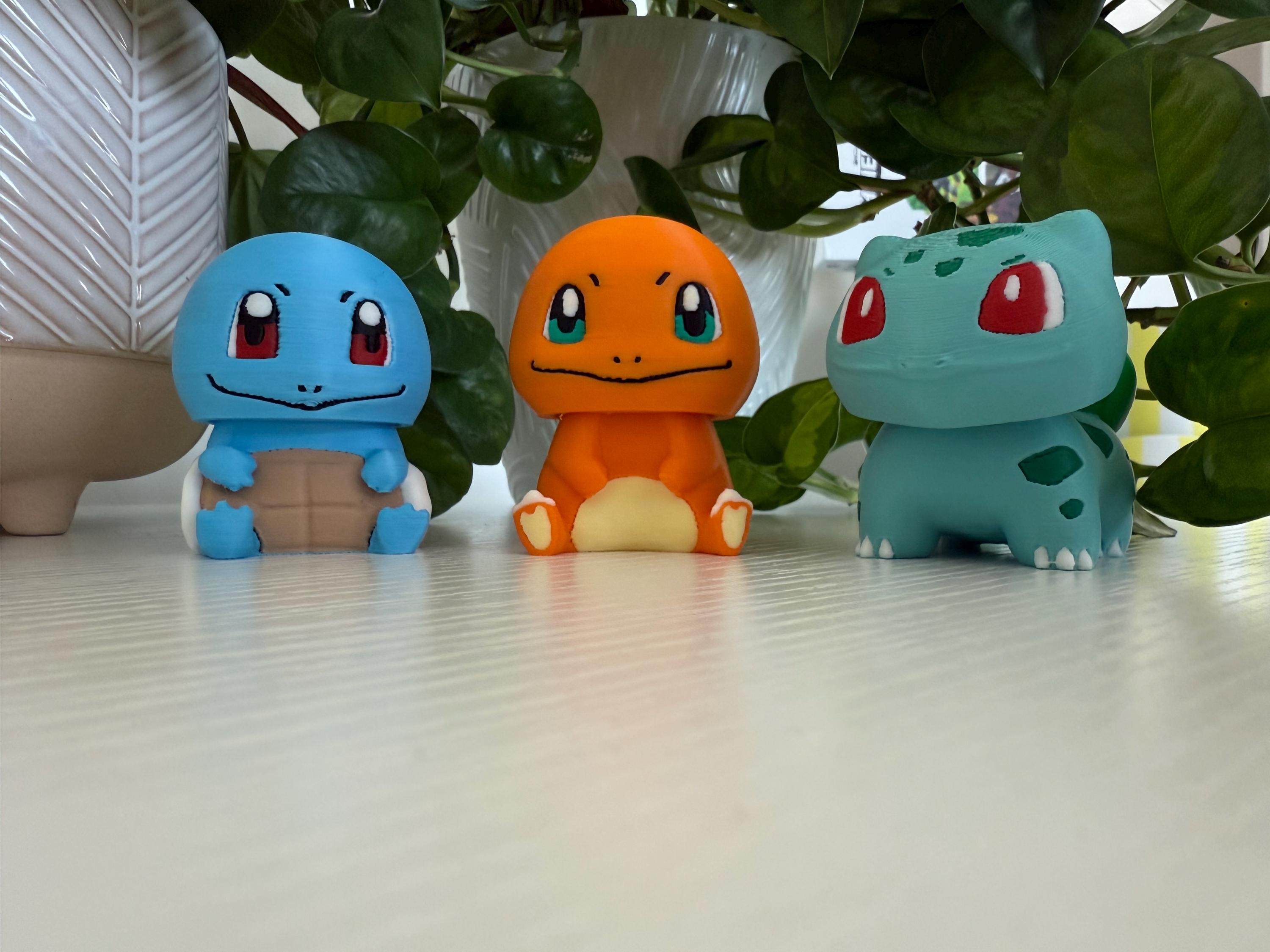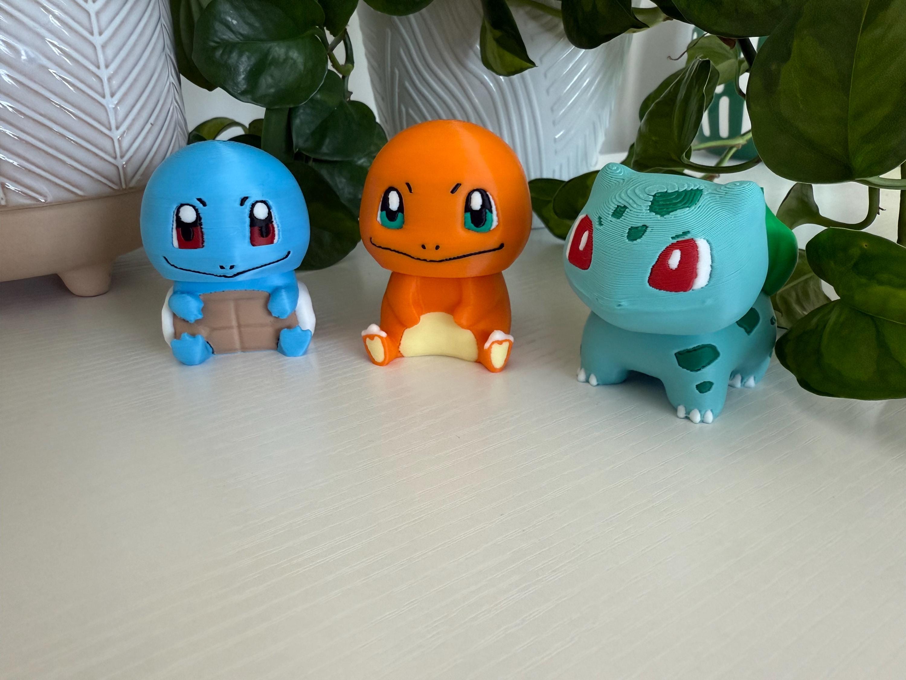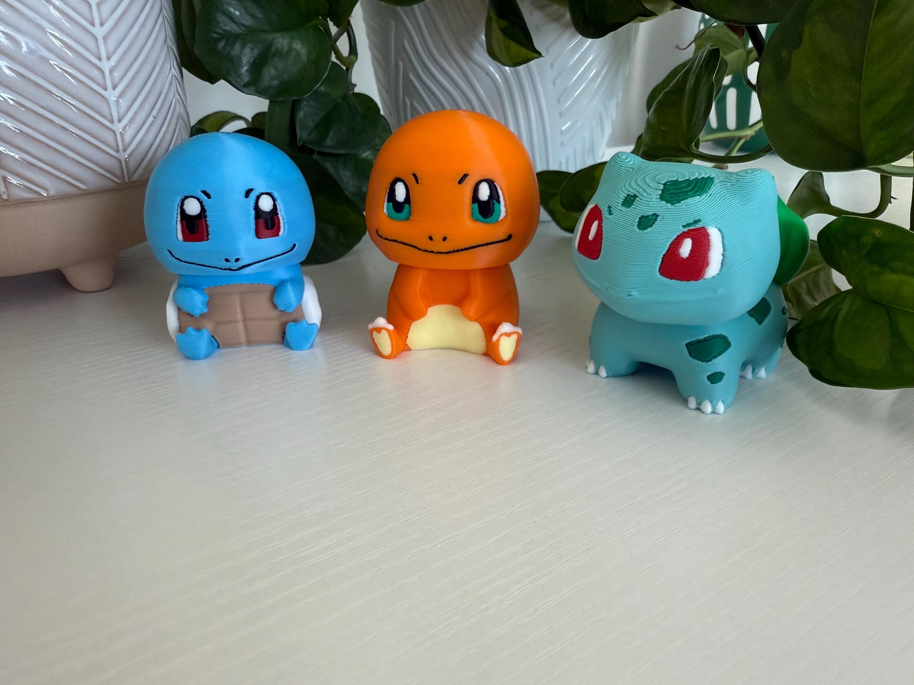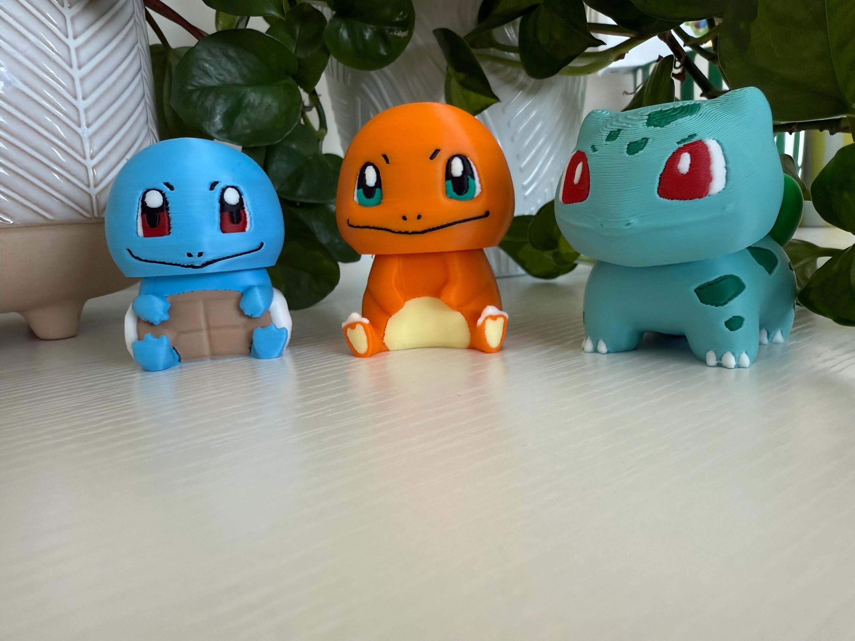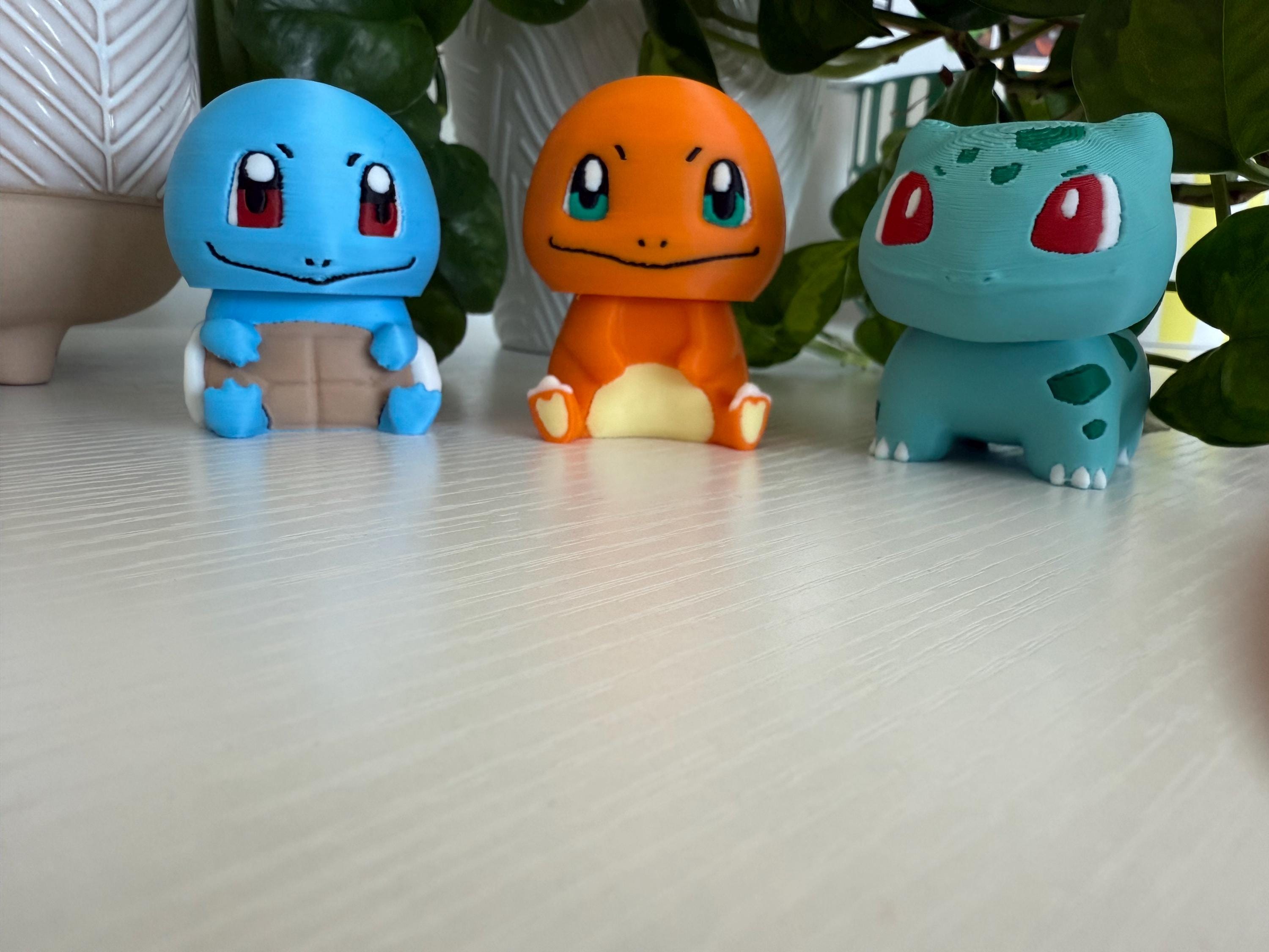 🔥 Charmander – orange with cream belly and tail flame 💧 Squirtle – blue body with a brown shell and bright eyes 🌿 Bulbasaur – teal body with signature green spots and bulb