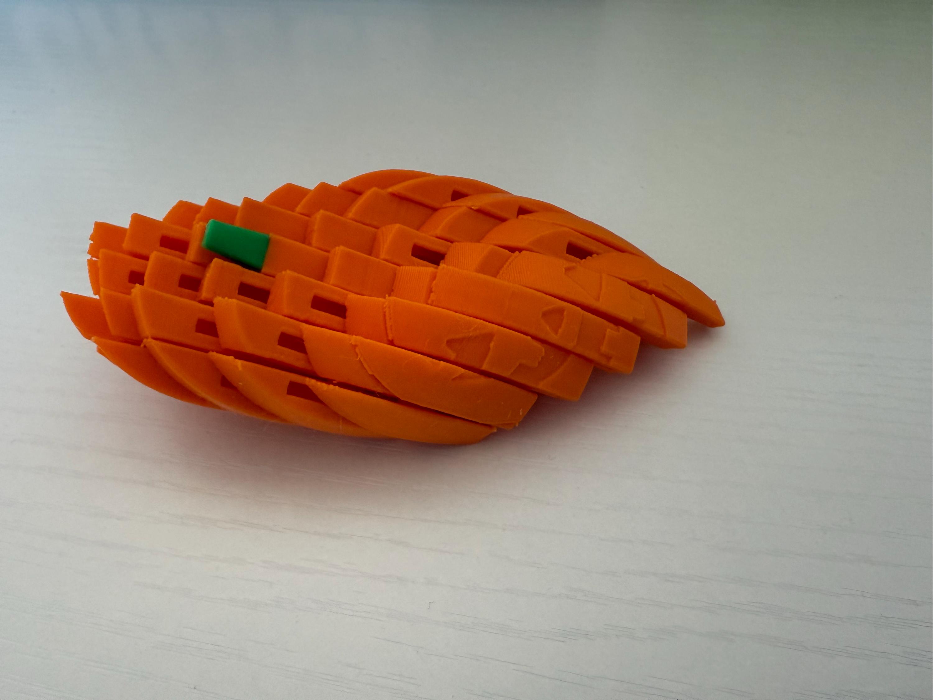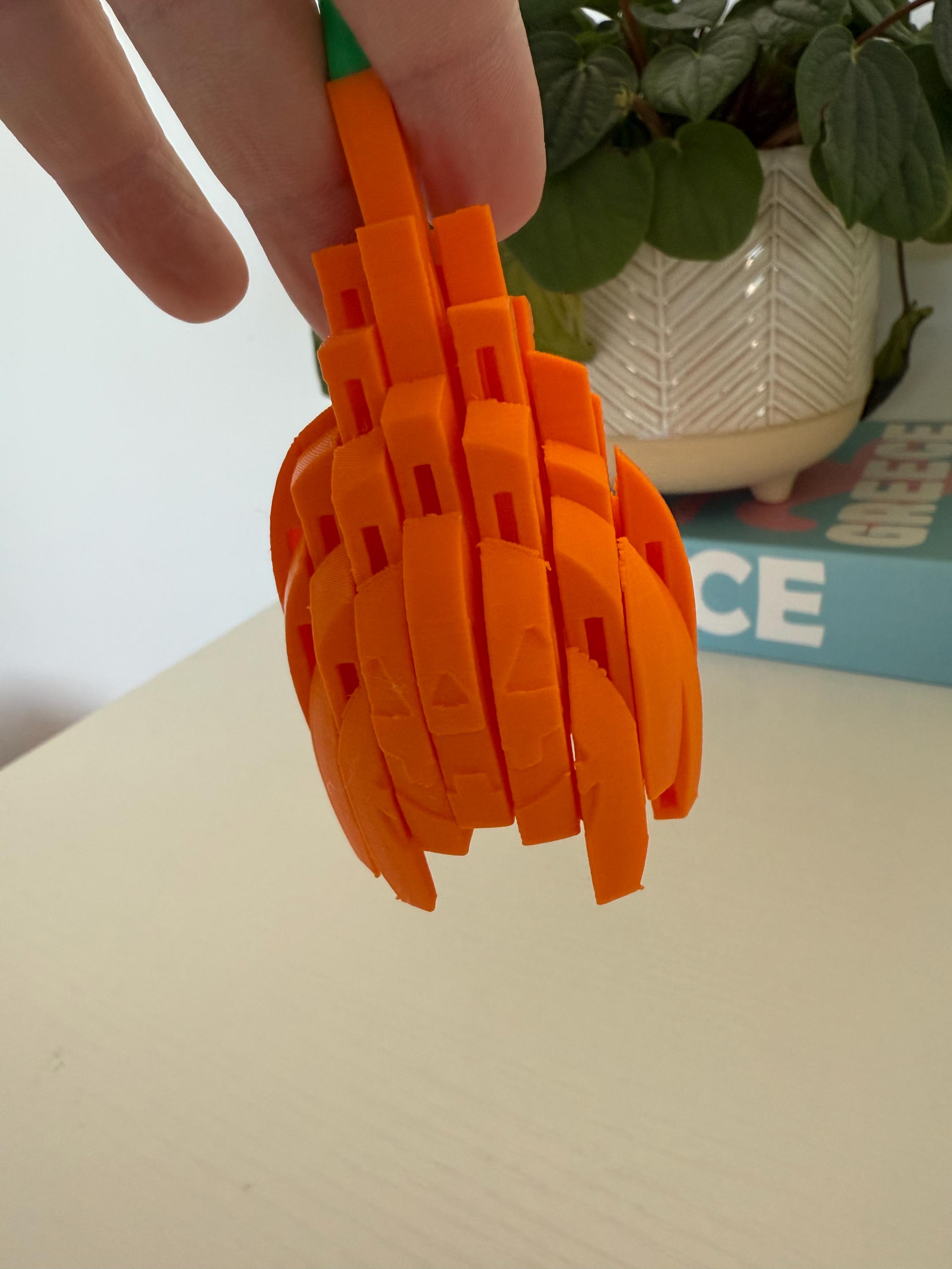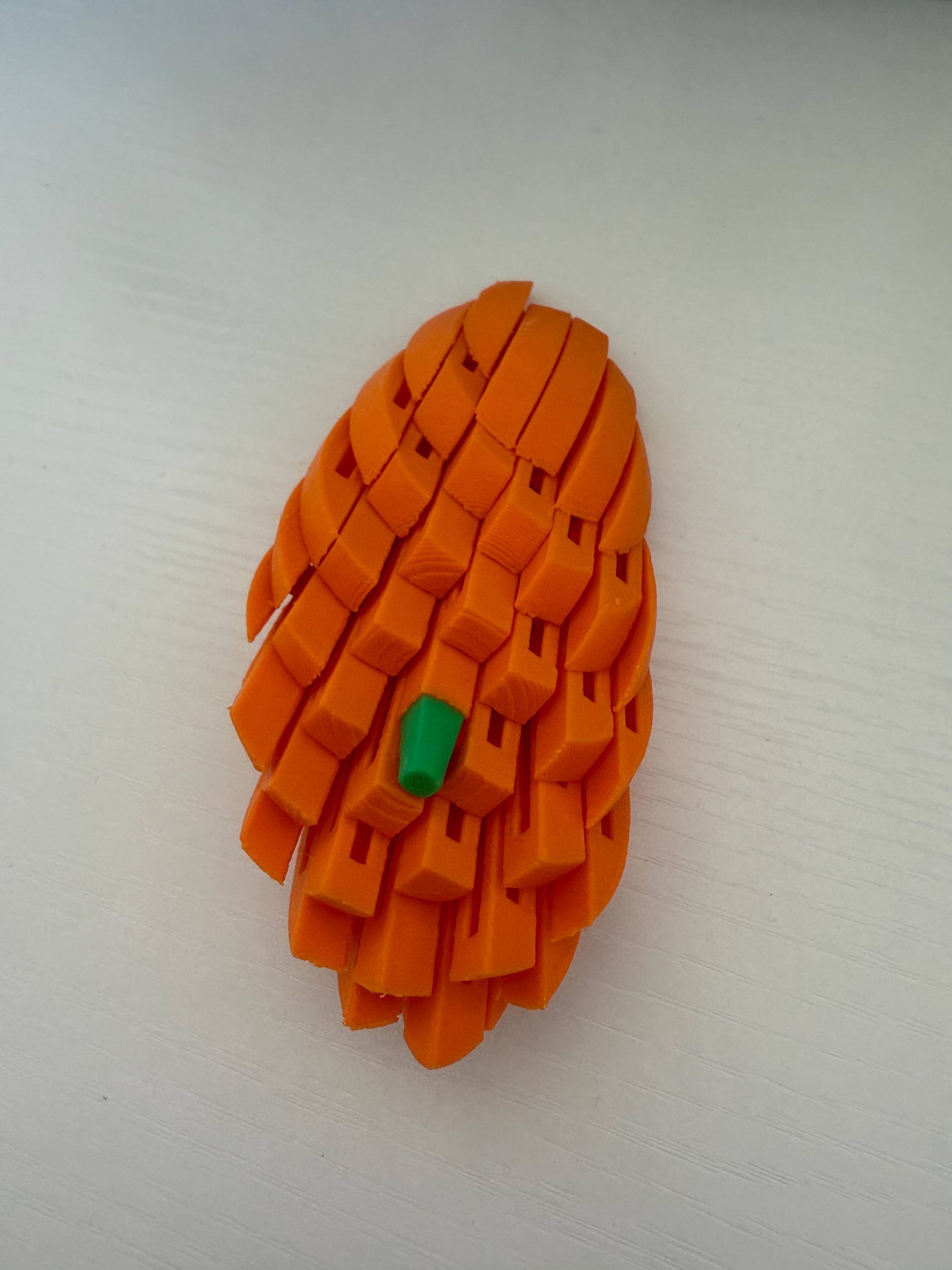 Great for Halloween parties, desk decor, or as a unique gift for gamers and collectors. Features & Specs Design: Pixelated Jack-O’-Lantern with hinged, foldable sections Material: High-quality PLA filament Color: Bright orange with green stem Movement: Opens, closes, and folds flat Size: Approx. 2.5 x 2.5 inches Uses: Seasonal decor, fidget toy, stocking stuffer, gamer gift Durability: Lightweight yet sturdy print