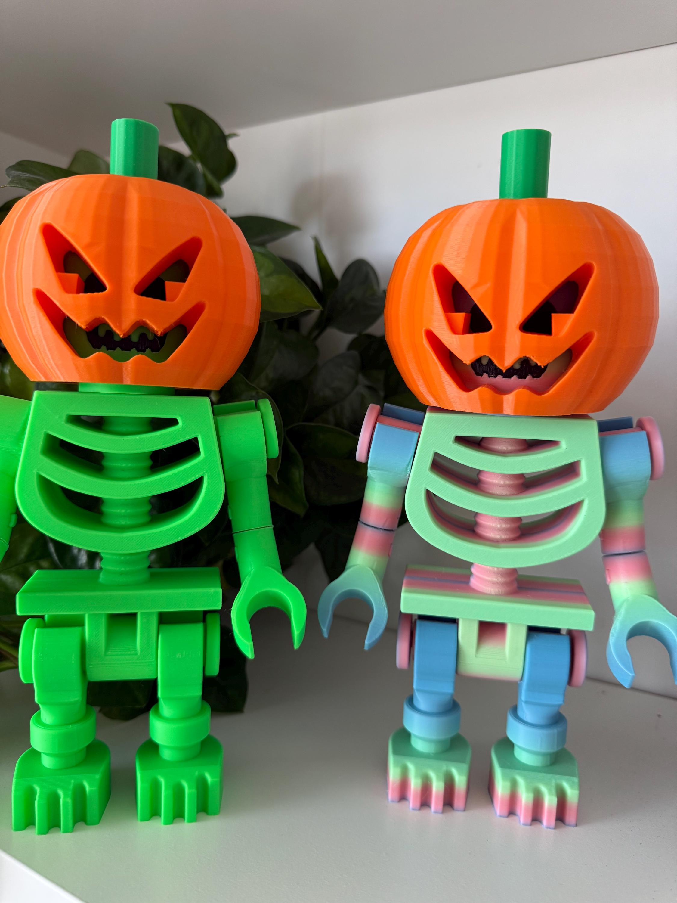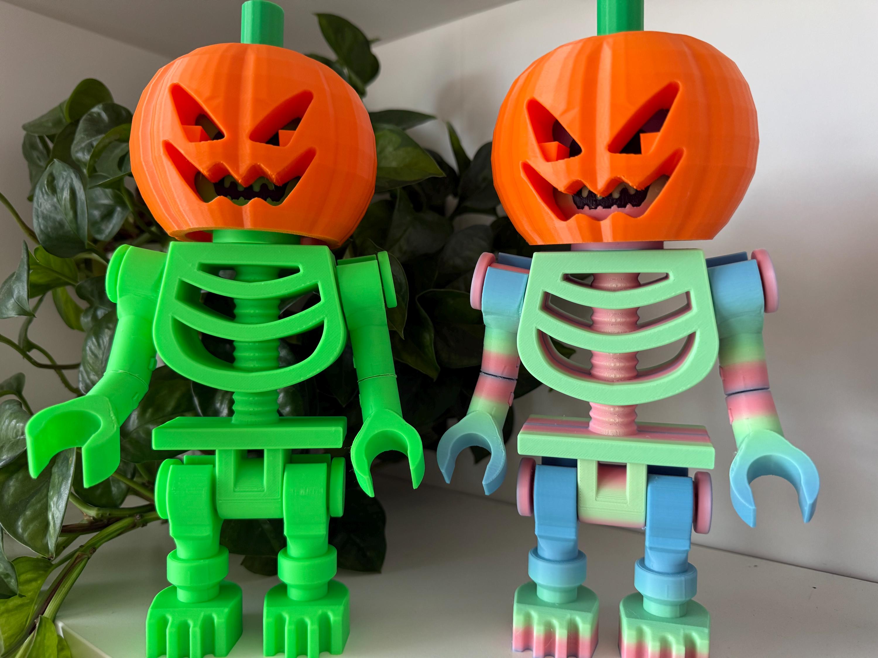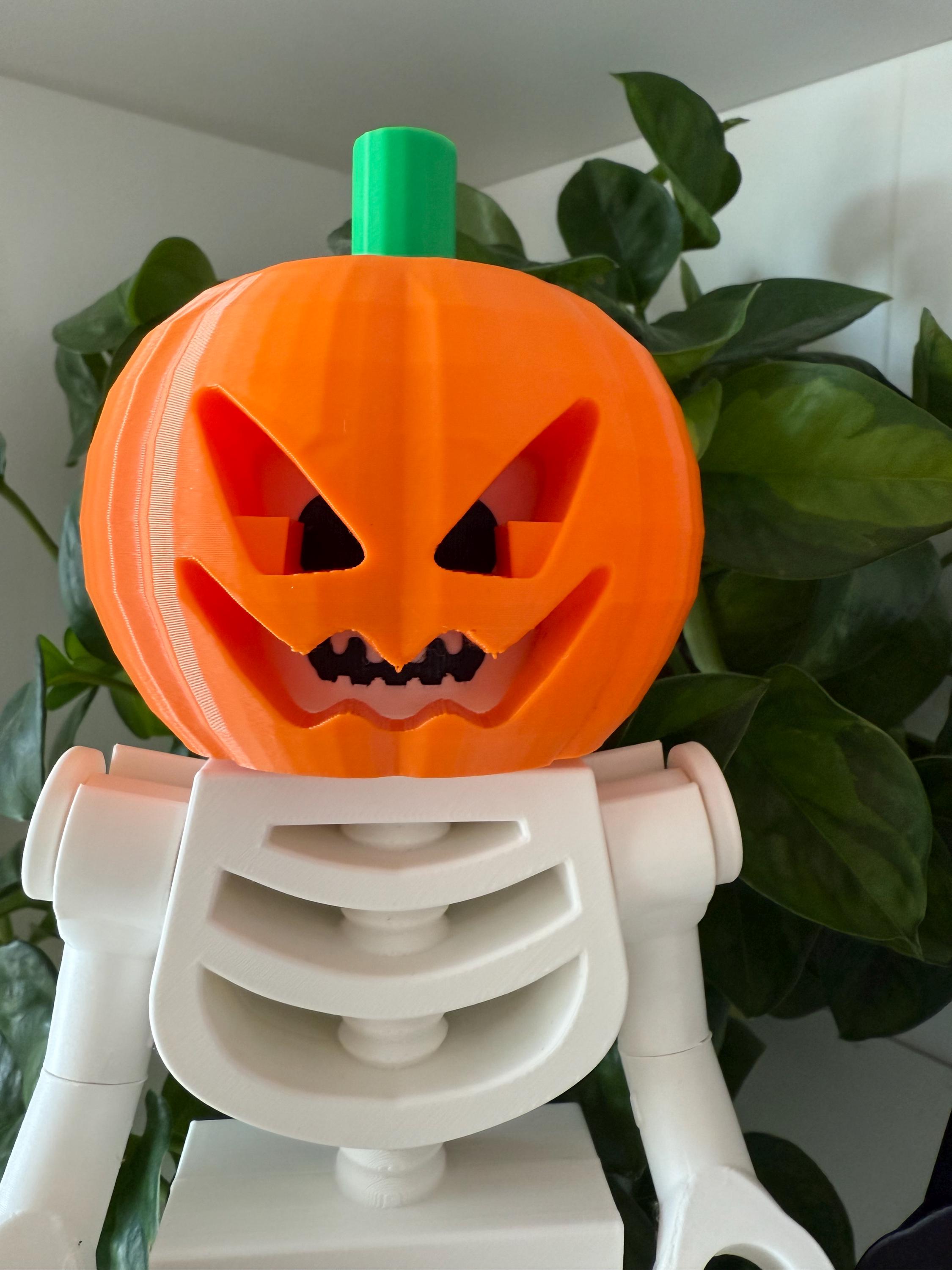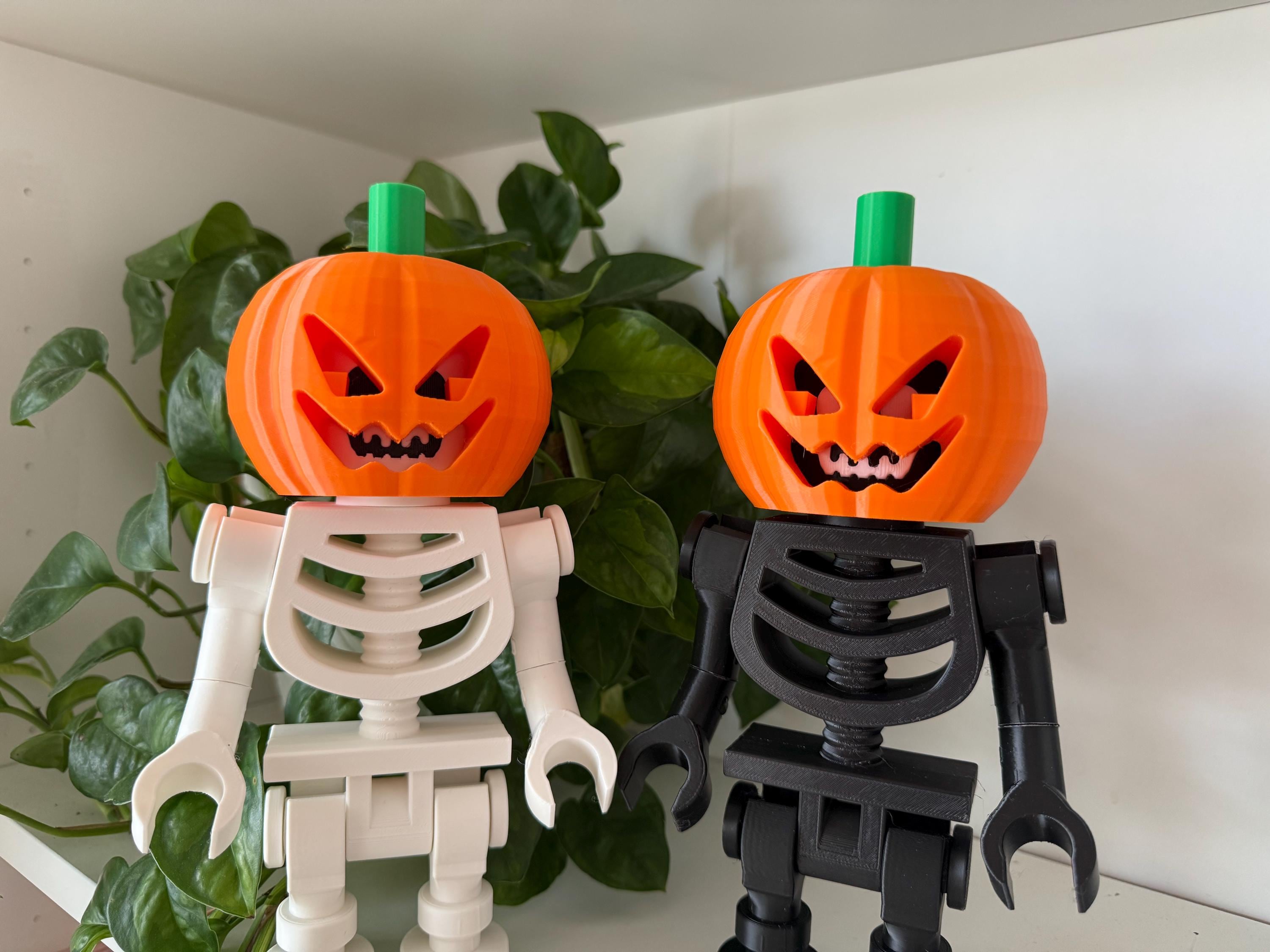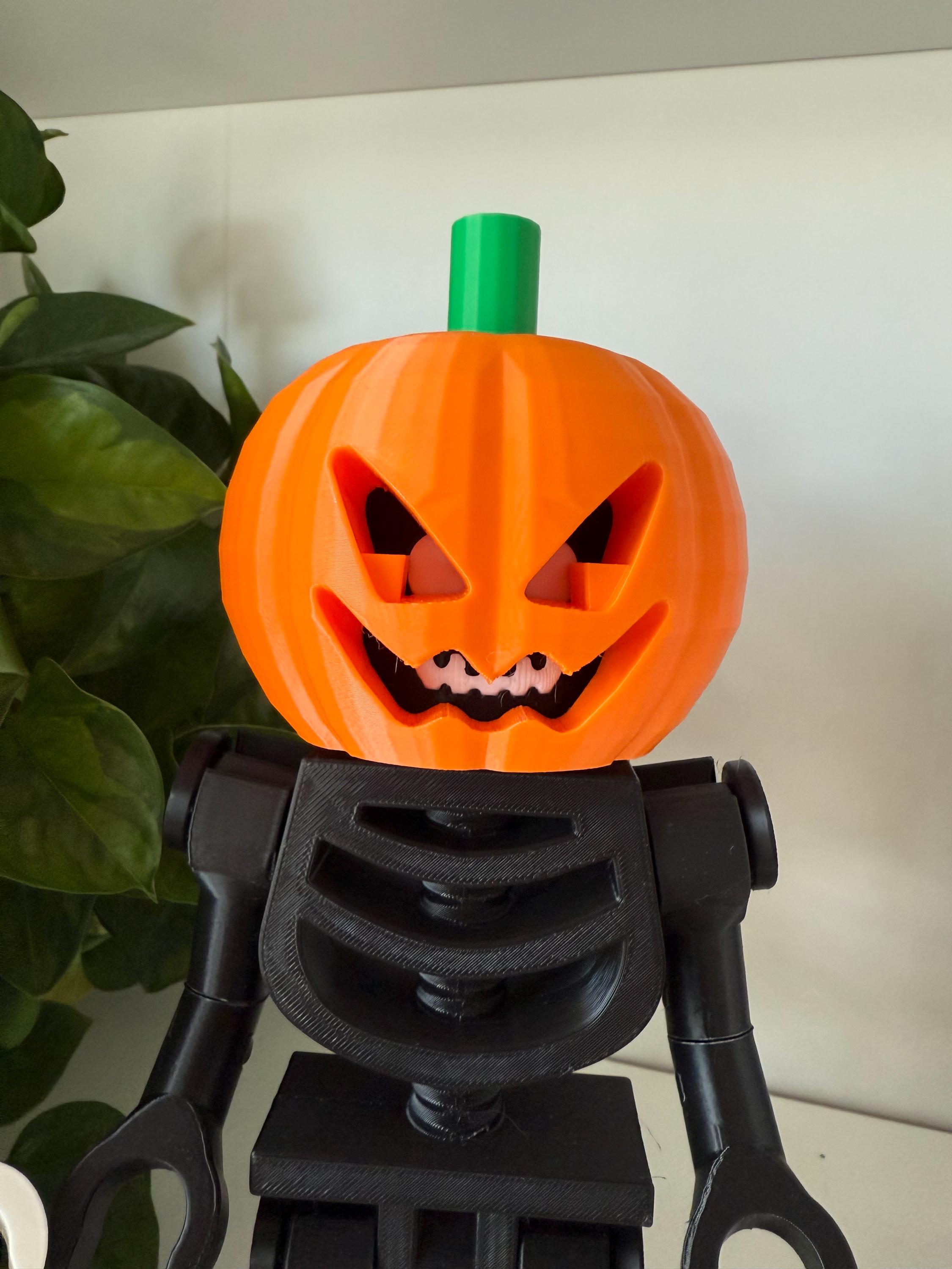 Give your skeleton a spooky seasonal upgrade with this 3D-printed pumpkin head add-on! Each jack-o-lantern features a sharp carved grin, deep eye cutouts, and a bright green stem. Designed to slide perfectly over the top of our 9" poseable LEGO skeleton, no adapters or extra parts needed.