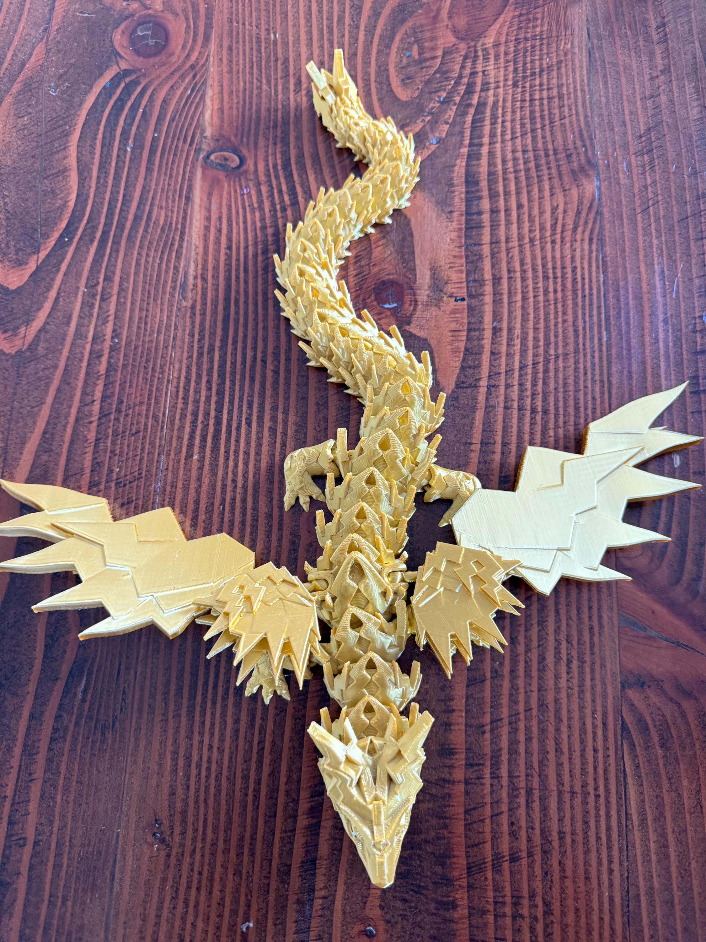 Each piece is 3D printed in high-quality golden PLA, creating a shimmering metallic finish that looks like living lightning. The flexible joints allow Thunderstrike to coil, stretch, and pose across shelves, desks, or display stands — a perfect balance of art, motion, and imagination.